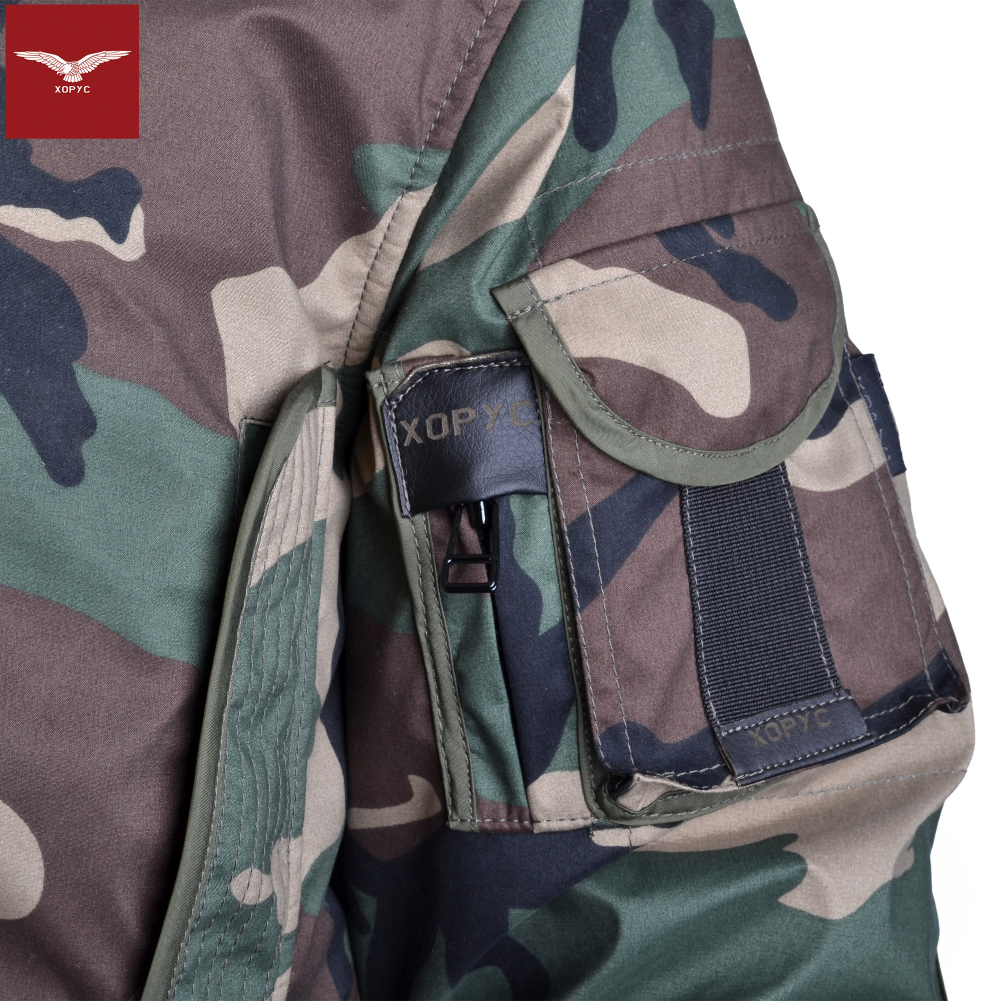 6 outer pockets, one smaller sleeve pocket;