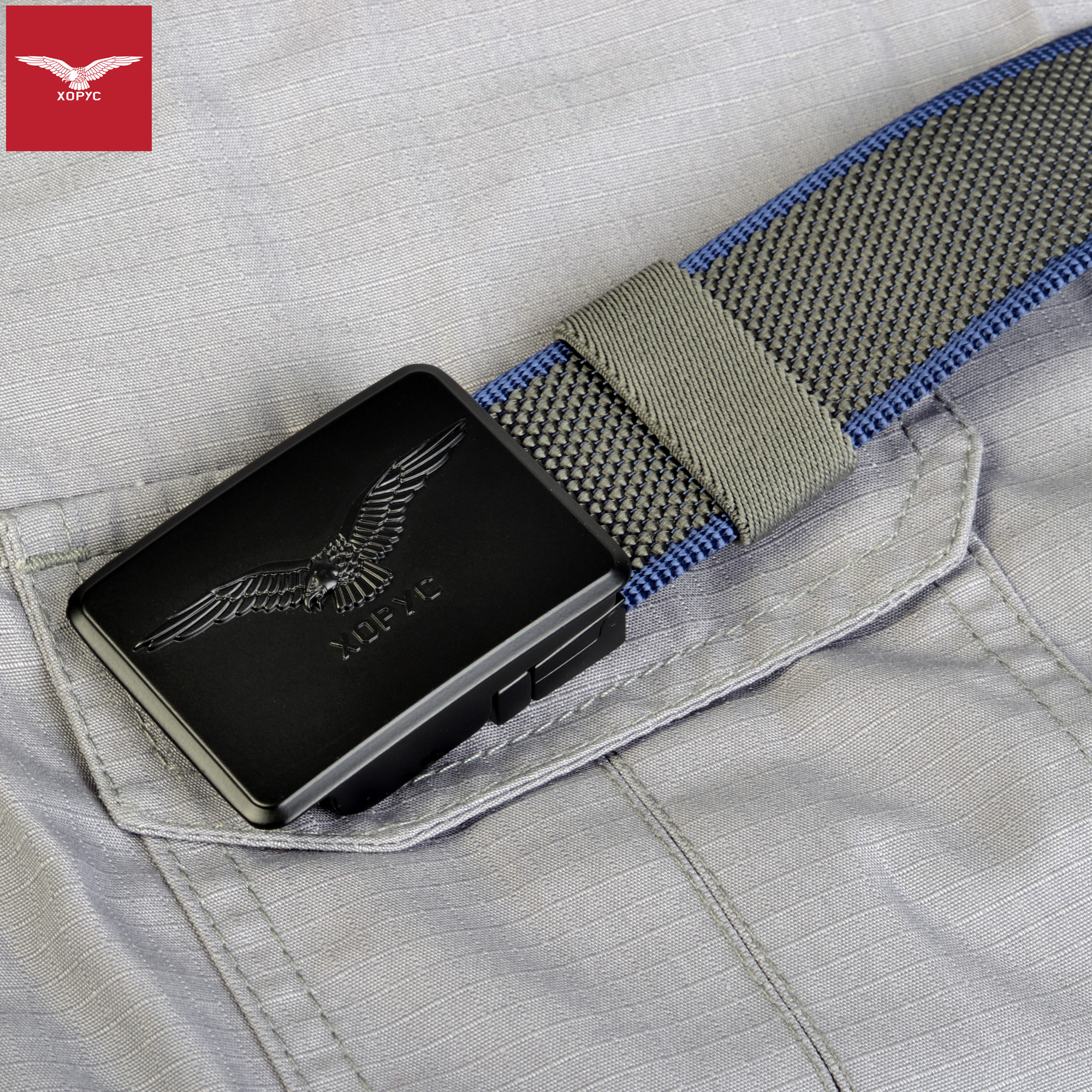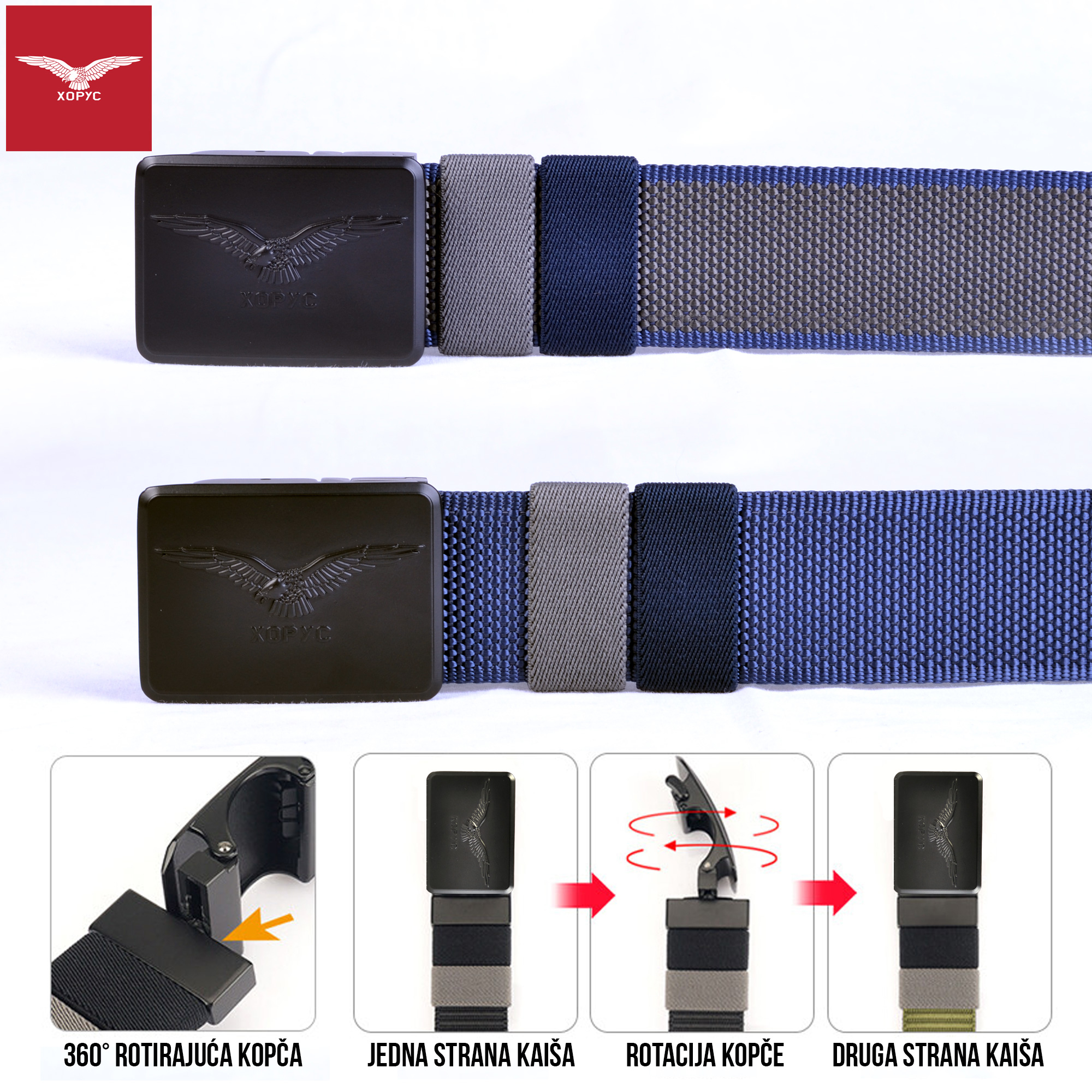 XOPYC - HORUS O-40 modni kaiš sa dva lica, idealan za sve prilike; Boja: teget - siva; Materijal rotirajuće HORUS kopče: metal; Materijal kaiša: 100% poliester; Kopča otporna na koroziju; Završna laserska obrada kaiša; Dužina kaiša: 125 cm (može se skratiti na odgovarajuću dužinu); Zemlja porekla: Kina.